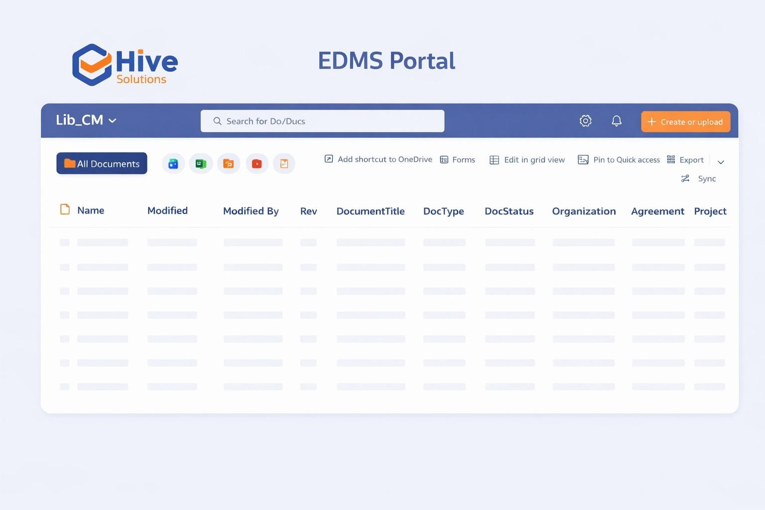Hive EDMS Portal is a SharePoint Online–based Enterprise Document Management System (EDMS) designed to centralize and govern enterprise documentation.